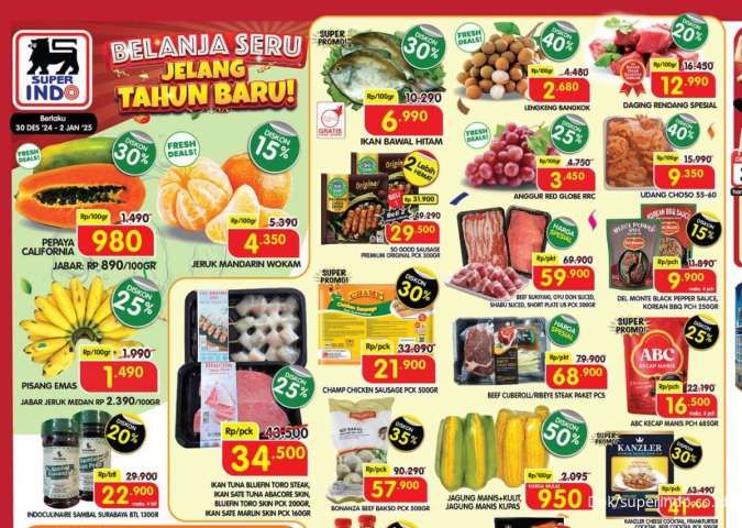 JAKARTA: Superindo kembali menghadirkan promo spesial weekday yang berlangsung selama empat hari, mulai Senin hingga Kamis. Promo ini menjadi momen tepat untuk berbelanja kebutuhan rumah tangga dan menikmati diskon besar menjelang tahun baru. Pada promo terbaru ini, yang berlaku mulai 30 Desember 2024 hingga 2 Januari 2025, Anda bisa mendapatkan berbagai produk favorit dengan potongan harga menarik.