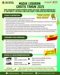SEMARANG, Jawa Tengah: Pemerintah Provinsi Jawa Tengah bersama dengan Pemerintah Kabupaten/Kota se-Jawa Tengah, PT Bank Jateng, PT Jasa Raharja, PT Semen Gresik, Baznas Provinsi Jawa Tengah, dan Perum Perumnas kembali menyelenggarakan program Mudik Gratis Lebaran 2025. Program ini ditujukan bagi warga Jawa Tengah yang merantau di wilayah Jabodetabek. Pendaftaran mudik gratis akan dibuka secara online melalui link https://pedamateng.penghubung.jatengprov.go.id/.