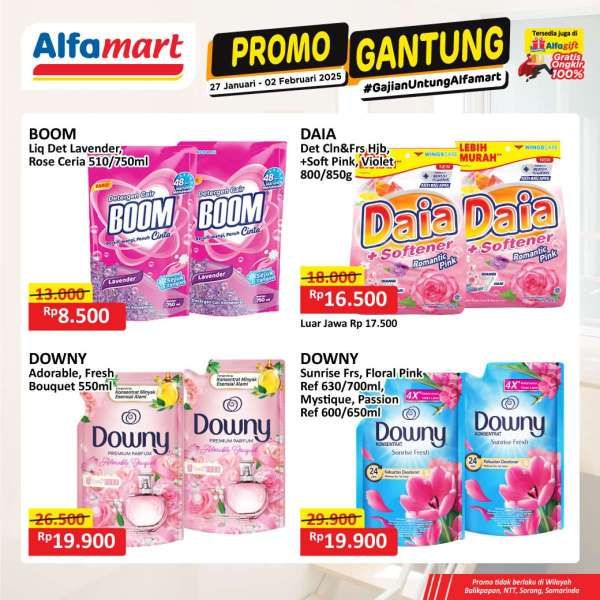 Alfamart menawarkan promo sabun mandi dan deterjen dalam dua kategori: Body Care Fair dan Home Care. Sabun mandi seperti Biore Guard, Shinzu’i, Lervia, Zen, Giv, Lactacyd, dan Lifebuoy mendapat diskon hingga 40%. Sementara itu, deterjen dari merek Attack, Sayang, dan Boom tersedia dengan harga mulai Rp 8.500. Promo ini bisa dinikmati di toko Alfamart terdekat atau melalui aplikasi Alfagift. Namun, harga promo tidak berlaku untuk wilayah Nusa Tenggara Timur.