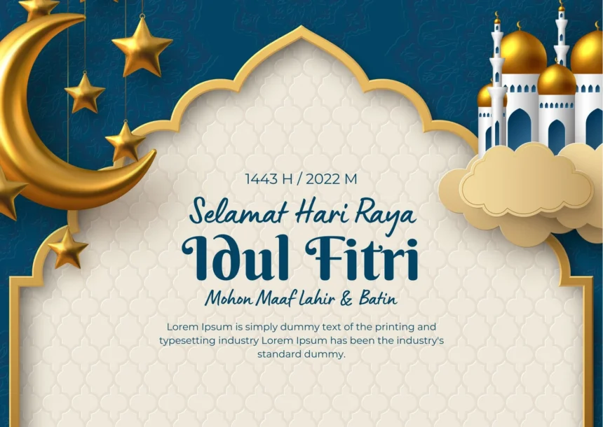 - Gunakan Elemen Grafis Islami Masukkan ikon seperti Ka’bah, bulan sabit, masjid, ketupat, atau motif arabesque untuk memperkuat nuansa Idulfitri.